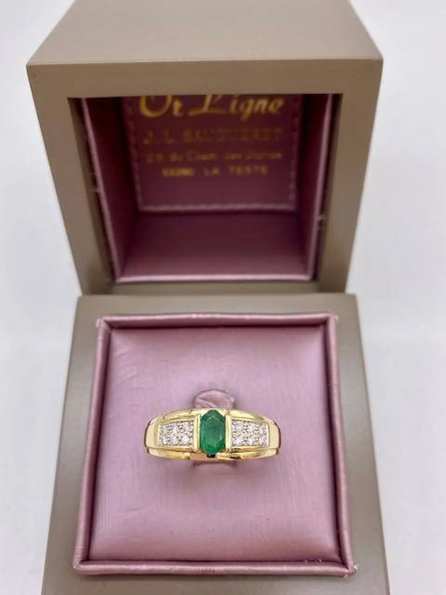 Votre Bijouterie Or Ligne à La Teste de Buch, sur le Bassin d'Arcachon, vous invite à découvrir parmi sa vitrine de bijoux en dépôt vente, cette belle bague en or 750/1000ème ( poinçon tête d'aigle).Elle se compose d' 1 émeraude centrale taille ovale po...